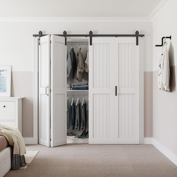 48 in. x 84 in. (Double 24 in.) Bi-Fold Paneled H shape Mid-Bar White Finished MDF Sliding Barn Door with Hardware Kit