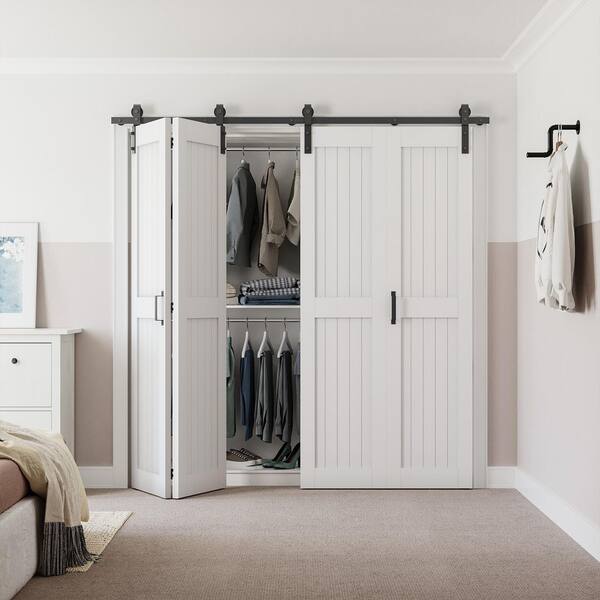 80 in. x 84 in. (Double 40 in.) Bi-Fold Paneled H shape Mid-Bar White Finished MDF Sliding Barn Door with Hardware Kit