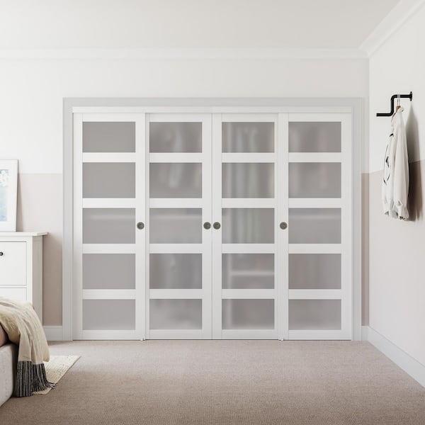 96 in. x 78.58 in. 5-Lite Frosted Glass Solid Core White Finished MDF Closet Sliding Door with Hardware Kit