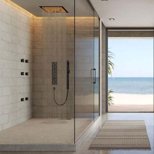 16 in. RGB LED And Temp 6-Jet Shower System 15-Spray with Anti Scald, Thermostatic Valve, Waterfall in Matte Black