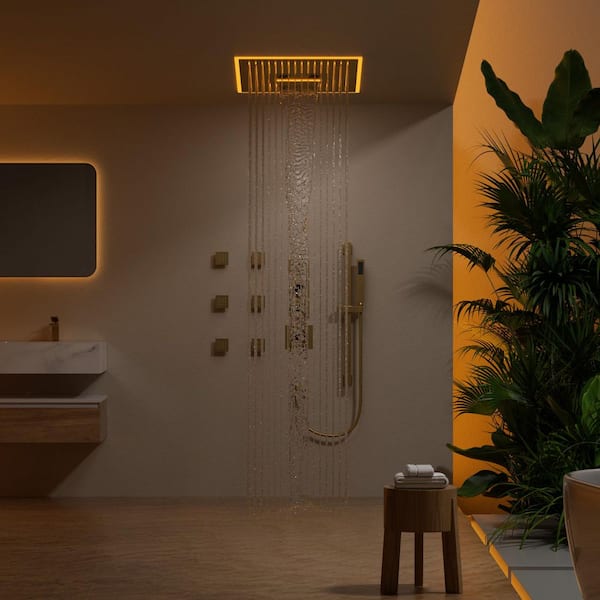 16 in. Square Aurora Shower System 17-Spray Ceiling Mount Fixed and Handheld Dual Shower Head 2.5 GPM in Brushed Gold