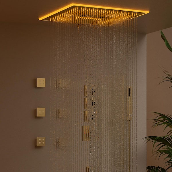 16 in. Square Aurora Shower System 17-Spray Ceiling Mount Fixed and Handheld Dual Shower Head 2.5 GPM in Brushed Gold