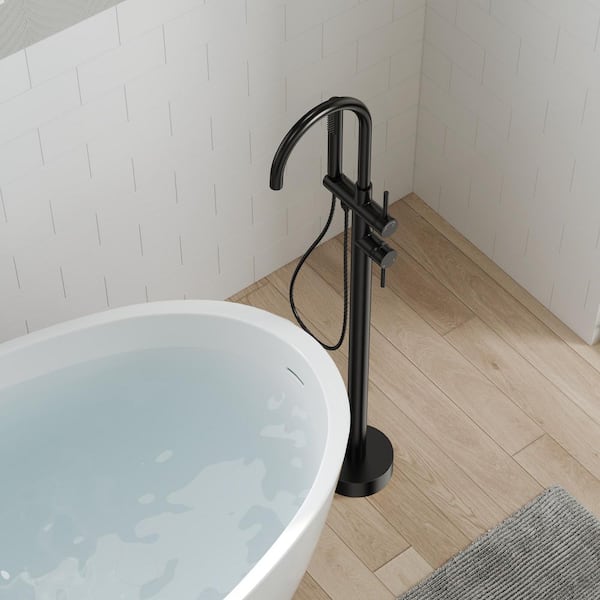 2-Handle Floor Mount Freestanding Tub Faucet with Hand Shower in Matte Black
