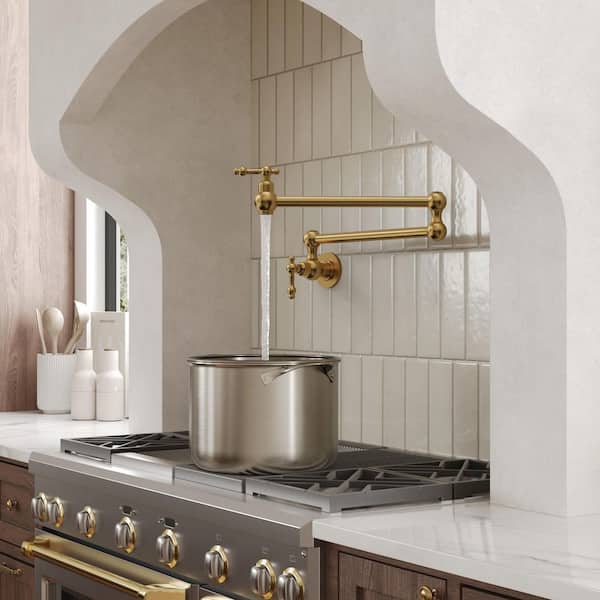 24 in. Wall-Mount Double-Handle Pot Filler Faucet with Dual Swing Arms Spot Resist in Brushed Gold