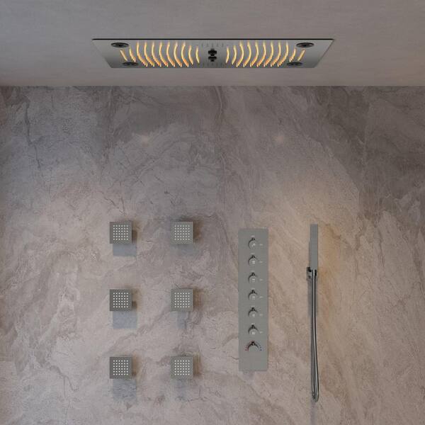 28 in. Rectangle Aurora 6-Spray Ceiling Mount Fixed and Handheld Dual Shower Head 2.5 GPM in Brushed Nickel