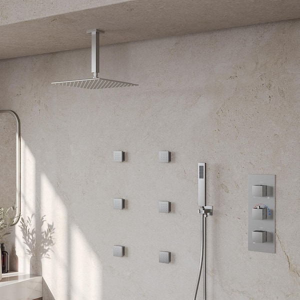 Anti Scald Shower Trims and Valve 5-Spray Ceiling Mount 12 in. Fixed and Handheld Shower Head 2.5 GPM in Brushed Nickel