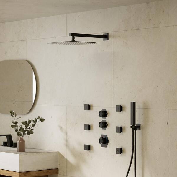 FlexiRain Triple Handle 5-Spray Shower Faucet 2.5 GPM with Dual Rainfall ShowerHeads,Thermostatic Valve in Matte Black