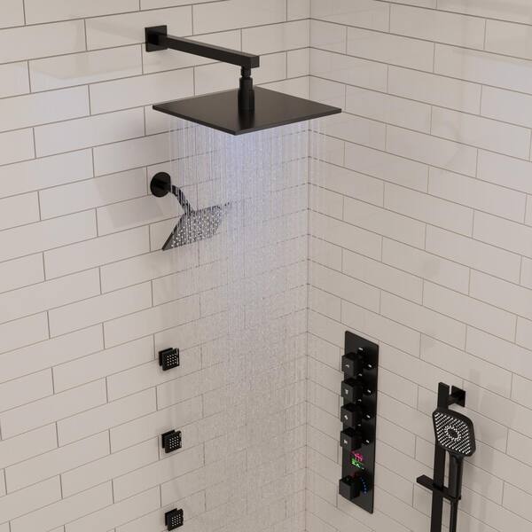 IntelliFlow 3-Jet 12in. and 6in. Dual Wall Mount Fixed with Slide Bar Hand-Shower and Thermostatic Valve in Matte Black