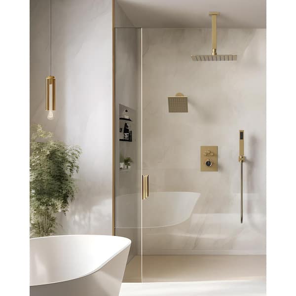 MultiplePress 12in. Dual 7-Spray Ceiling Mount Fixed and Handheld Shower Head 2.5 GPM with Basin Faucet in Brushed Gold