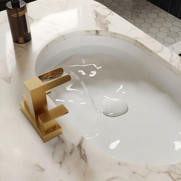 Open Trough Waterfall 4 in. Centerset Double Handle Bathroom Faucet 1.03 GPM in Brushed Gold Drain Not Included