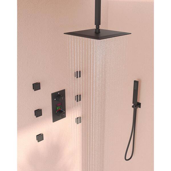 Pressure Balance Temperature Display 3-Spray Ceiling Mount 12 in. Fixed and Handheld Shower Head 2.5 GPM in Matte Black