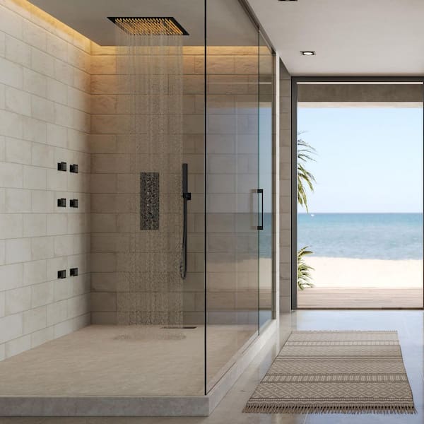 RBG LED with Thermostatic Valve 7-Spray Ceiling Mount 20 in. Dual Fixed and Handheld Shower Head 2.5 GPM in Matte Black