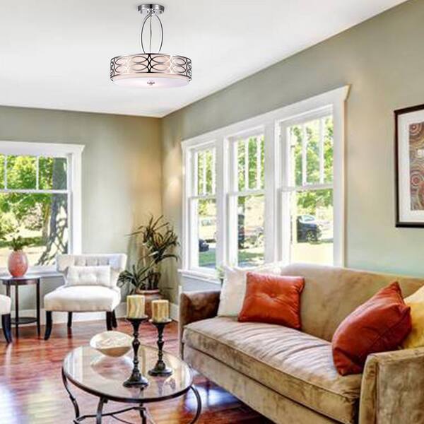 Pavot 17 in. 3-Light Chrome Drum Semi-Flush Mount with White Fabric Shade and No Bulbs Included, for Dining/Living Room