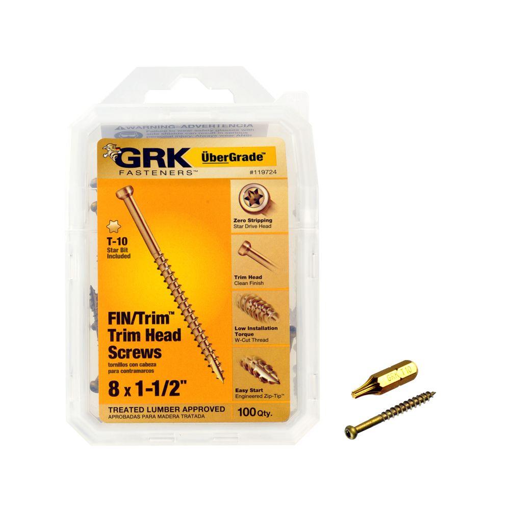 The GRK Fasteners #8 x 2 in. Finish Trim Screws (100 per Pack) feature a self-tapping design with a Zip-Tip to help prevent most material from splitting. The screws are useful for all trim and fine carpentry applications. A small diameter head allows for a clean finish.