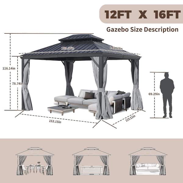 12 ft. x 16 ft. Galvanized Steel Double Roof Hardtop Gazebo with Aluminum Frame, Mosquito Netting&Curtains for Garden