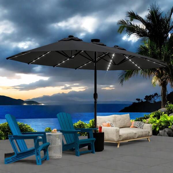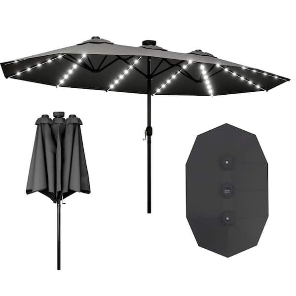 15 ft. Iron Hidden LED Lighted Outdoor Double Sided Umbrella Market Patio Umbrella with Rocker, UV Protection in Grey