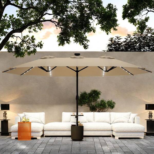 15 ft. Iron Hidden LED Lighted Outdoor Double Sided Umbrella Market Patio Umbrella with Rocker, UV Protection in khaki