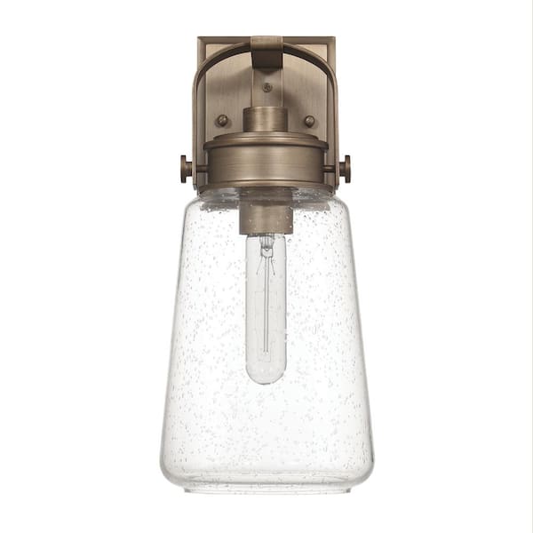 • Tapered seedy glass and tuscan gold finish for an industrial look