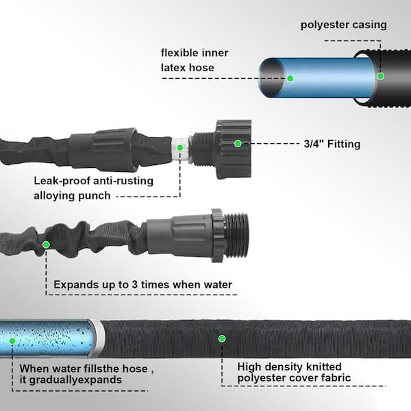 3/4 in. x 100 ft. Expandable Water Hose with 7 Function Spray Nozzle, Outdoor Garden Hose, Black