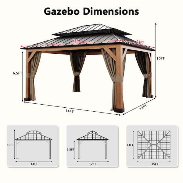 15 ft. x 13 ft. Wood Grain Aluminum Double Galvanized Steel Roof Gazebo with Ceiling Hook, Mosquito Netting and Curtains