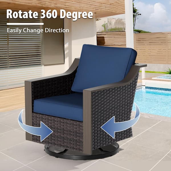2-Piece Brown Wicker Outdoor Rocking Chair Patio Swivel Chair Set with Blue Cushion