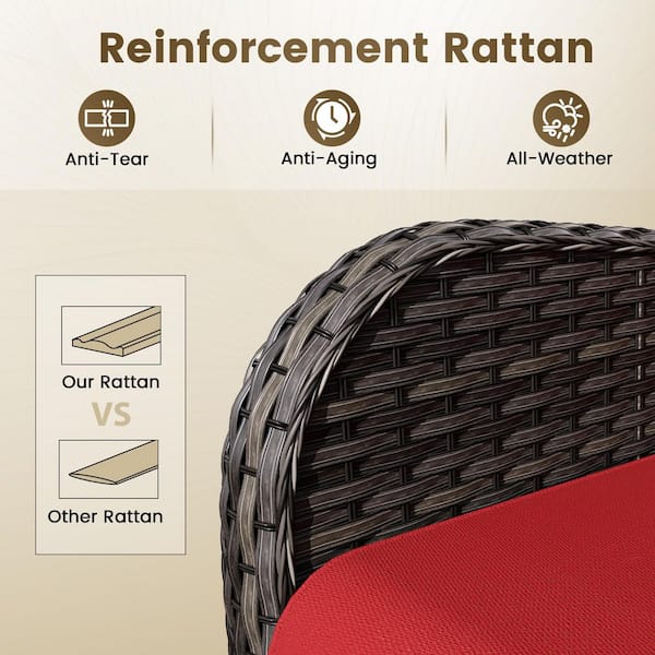 3-Piece Wicker Patio Outdoor Lounge Chair Set with Red Cushions and Side Table