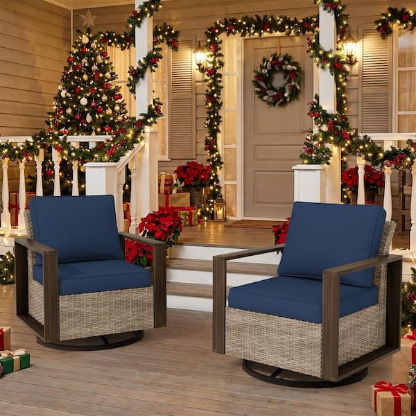 Wicker Outdoor Rocking Chair Patio Swivel Chair with Metal Frame and Dark Blue Cushions