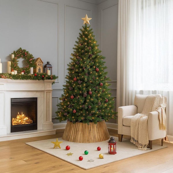 Natural Wood Christmas Tree Collar Box with Slatted Panel Design Foldable Tapered Base Cover