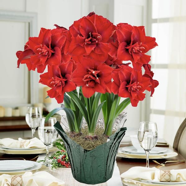 Inferno Double Red Flowering Amaryllis (Hippaestrum) 3 Bulb Holiday Gift Kit, Planted in a Foil Wrapped 9 in.Pot