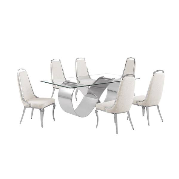 Garrett 7-Piece Clear Tempered Glass Top with Gold Stainless Steel Base Dining Set with 6 Cream Boucle Fabric Chairs