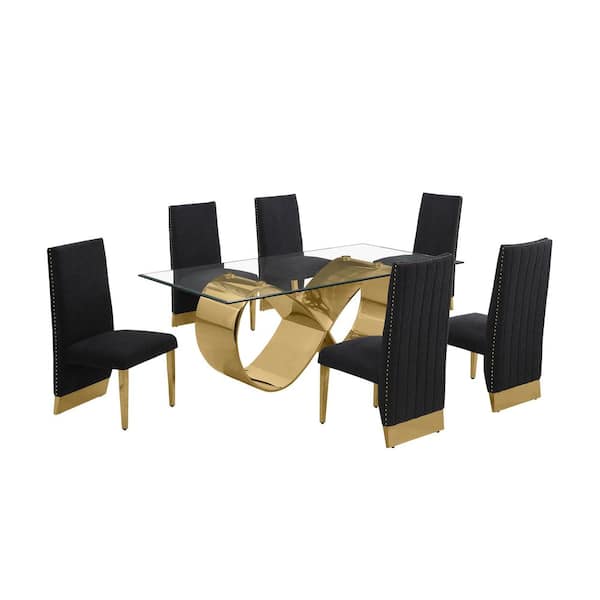 Garrett 7-Piece Clear Tempered Glass Top with Gold Stainless Steel Base Dining Set with 6 Grey Chairs