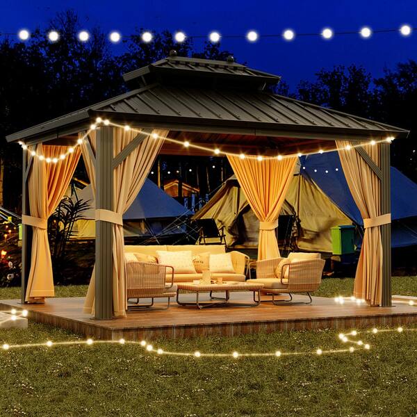 13 ft. x 10 ft. Double Roof Hardtop Gazebo for Patio with Galvanized Steel Roof, Brown Curtains and Netting