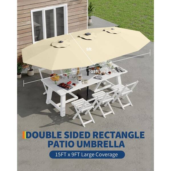 15 ft. Rectangular Solar LED Lighted Double-Sided Market Patio Umbrella with Crank Lift and Base in Beige