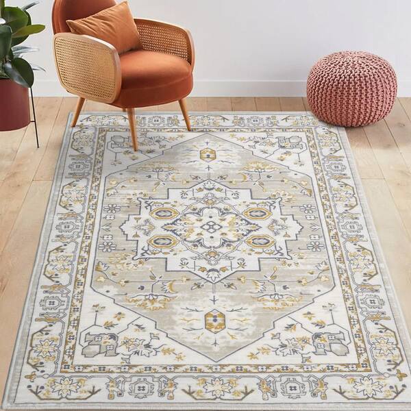 Beige 5 ft. x 7 ft. Washable Floral Indoor Living Room Area Rug