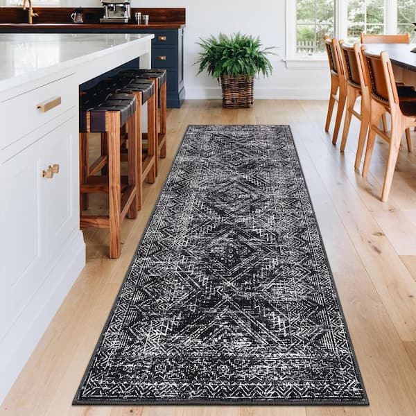Black 2 ft. x 6 ft. Washable Vintage Distressed Bohemian Style Polyester Area Rug