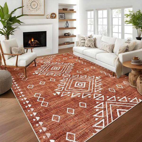 Brick Red 9x12ft Geometric Retro Corridor Strip Carpet Tribal Style Distressed Area Rug