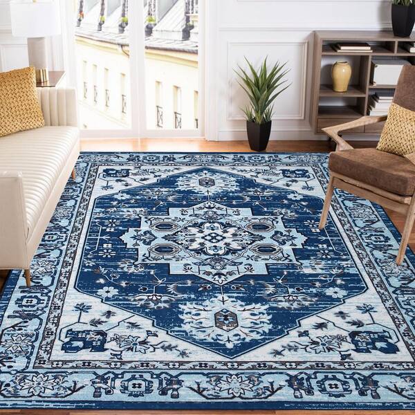 Navy 3 ft. x 5 ft. Washable Floral Indoor Living Room Area Rug