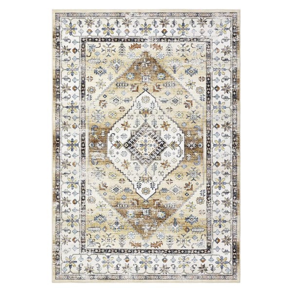 Retro Carpet Yellow 9 ft.x12 ft. Machine Washable Printed Timedelay Short Pile Nonslip Rug Soft Foldable Indoor Area Rug