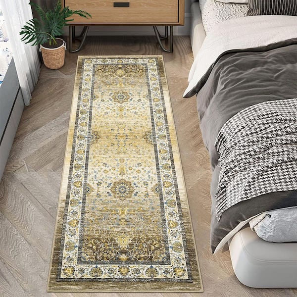 Soft Vintage Distressed Carpet Short Pile Non-slip Rug Washable Printed Rug Living Room Decorative Rug Yellow 2X6ft
