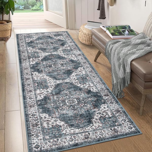 Ultra-Thin Washable Vintage Floral Rug Soft Non-Slip for Bedroom Living Room Office Blue 2 ft. x 6 ft. Area Rug