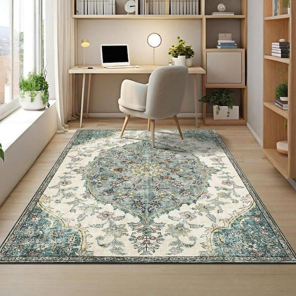 Vintage Printed Low Pile Nonslip Thin Carpet Living Room Decorative Carpet Bedroom Kitchen Green 8 ft. x 10 ft. Area Rug