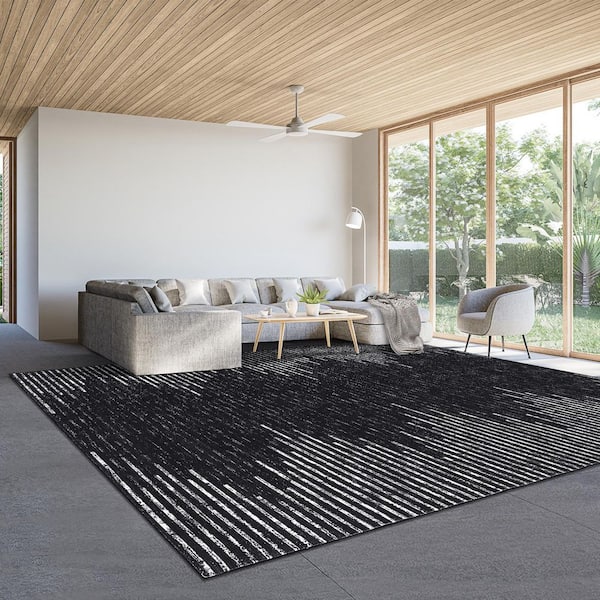 Washable Black 4 ft. x 6 ft. Modern Striped Printed Rug Low Pile Soft Thin Carpet Stain Resistant Non-Slip, Area Rug
