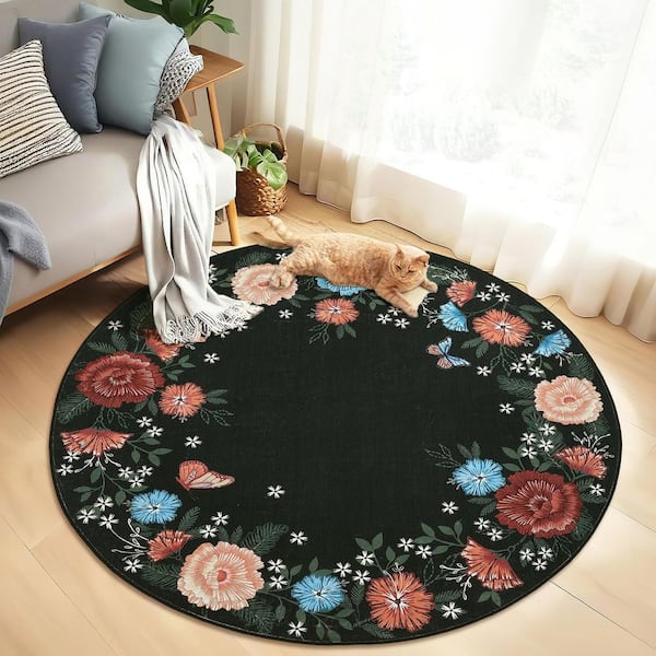 Wavy Edge Decorative Machine Washable Vintage Floral Printed Carpet for Bedroom Apartment Black 4 ft. x 4 ft. Area Rug