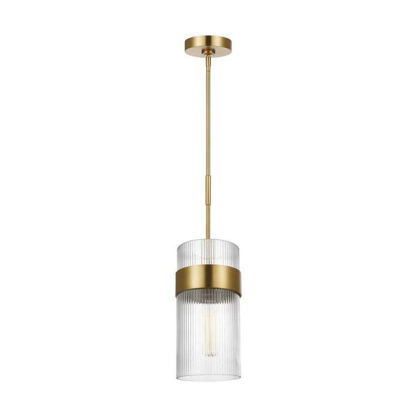 Geneva 7 in. W x 13.75 in. H 1-Light Burnished Brass Mid-Century Dimmable Large Pendant Light with Clear Glass Shade