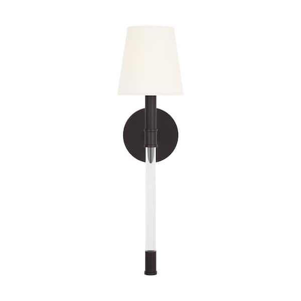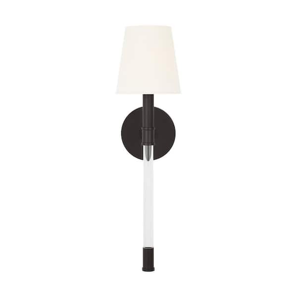 Hanover 5 in. W x 18.625 in. H 1-Light Aged Iron Dimmable, Mid-Century Wall Sconce with White Linen Fabric Shade