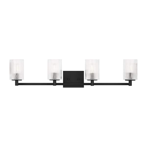 Lando 35 in. W 4-Light Midnight Black Bathroom Vanity Light with Clear Fluted Glass Shades and LED Bulbs Included