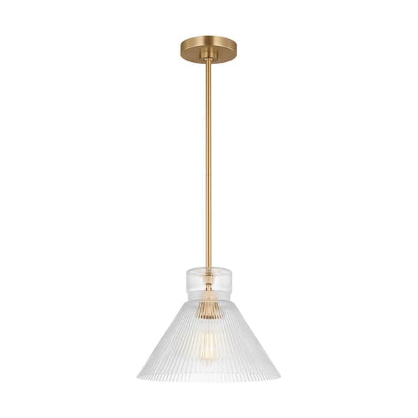 Liouet 12 in. W x 9 in. H 1-Light Satin Brass Transitional Pendant Light with Clear Ribbed Glass Shade