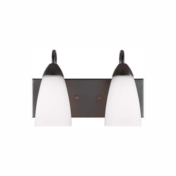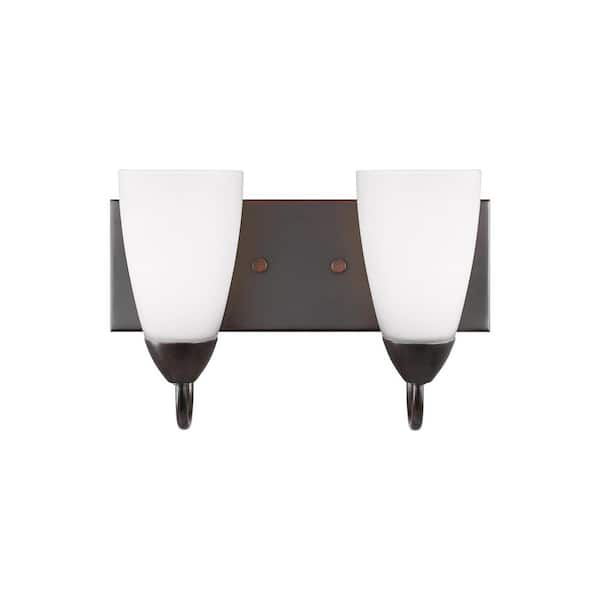 Seville 13 in. 2-Light Bronze Transitional Modern Wall Bathroom Vanity Light with White Glass Shades and LED Bulbs