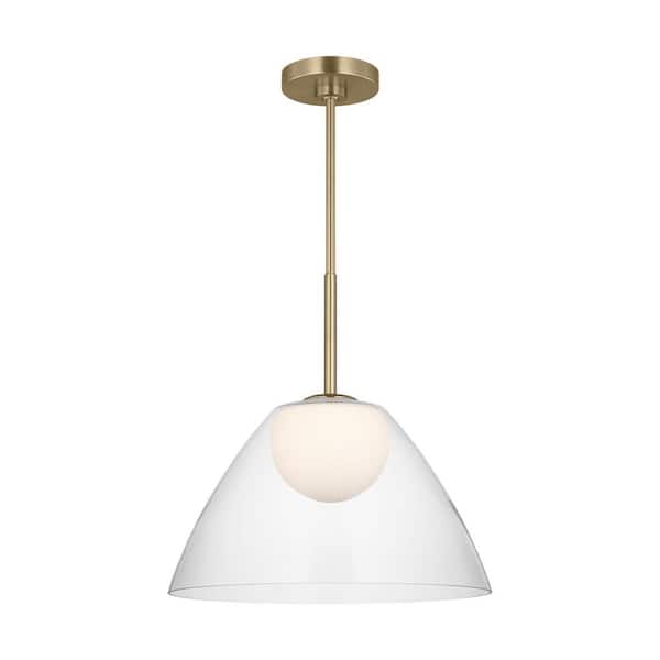 Suma 16 in. W x 16.375 in. H 1-Light Satin Brass Modern Pendant Light with White Opal Etched and Clear Glass Shade