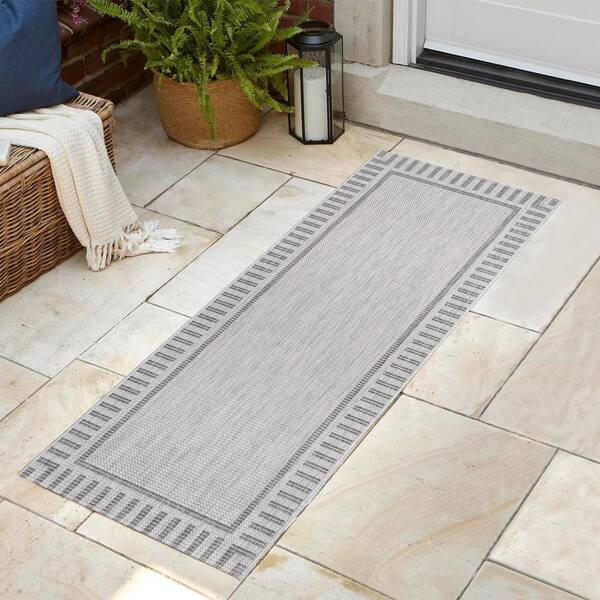 Paseo Kiano Ash/Steel 2 ft. x 6 ft. Striped Border Indoor/Outdoor Runner Rug